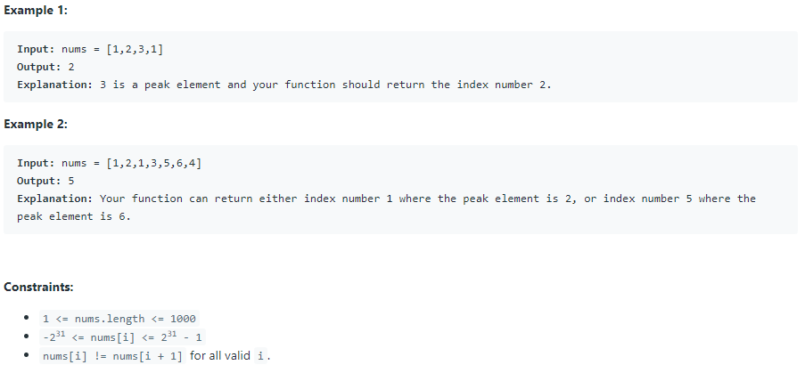 Given an integer array nums, find a peak element, and return its index. If the array contains multiple peaks, return the index to any of the peaks.