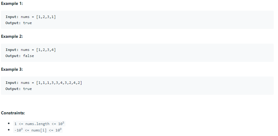 def containsDuplicate(self, nums: List[int]) -> bool: