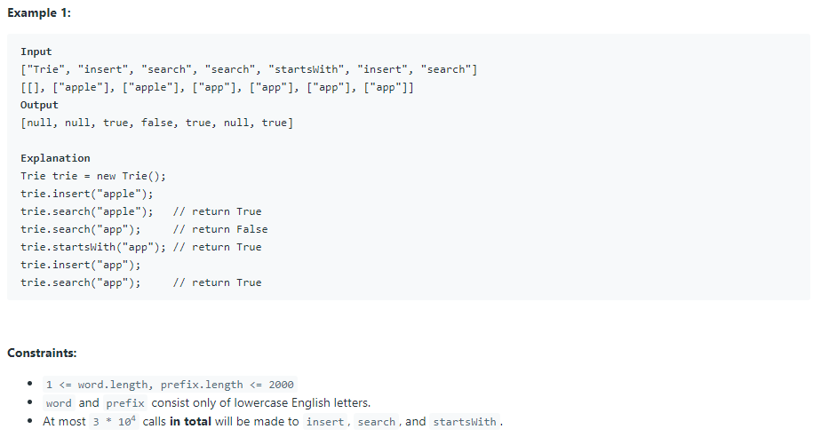 - boolean startsWith(String prefix) Returns true if there is a previously inserted string word that has the prefix prefix, and false otherwise.